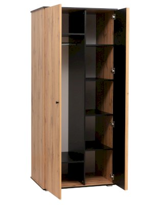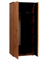 Шкаф для одежды внешне выглядит также, как модуль 51.01, с двумя распашными дверцами, но имеет совсем другое внутреннее наполнение. Если же присмотреться повнимательнее, то становятся заметны и внешние различия. У этого шкафа другая глубина – она гораздо больше, целых 603 мм, поэтому штанга для одежды помещается стандартно, а одежда на вешалках висит тоже, как обычно – боком, а не лицевой стороной.