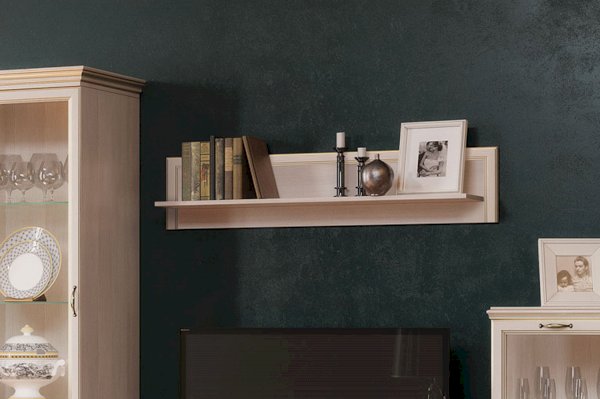 Настенная полка - это неизменный и важный атрибут гостиной спальни или детской комнаты. В модульной коллекции "Cиена" вы найдёте широкий выбор различных полок и сможете подобрать нужную именно вам модель. Представленный вам модуль универсален и подходит ко многим изделиям из коллекции. Декоративная отделка в виде фигурного профиля с золотой патиной подчеркивает классический стиль, а ЛДСП светлого оттенка «Бодега белый» с древесной текстурой подарит тепло и уют интерьеру спальни или гостиной.
