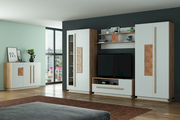 Корпус комода выполнен из ЛДСП. Фасады изготовлены из МДФ, окутанного пленкой ПВХ цвета Белый глянец. Декоративные элементы прямоугольной формы на фасадах имитируют спил дерева. Эффект древесного рисунка достигается благодаря техники УФ-печати.