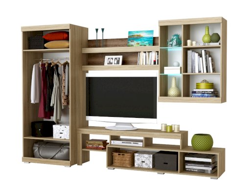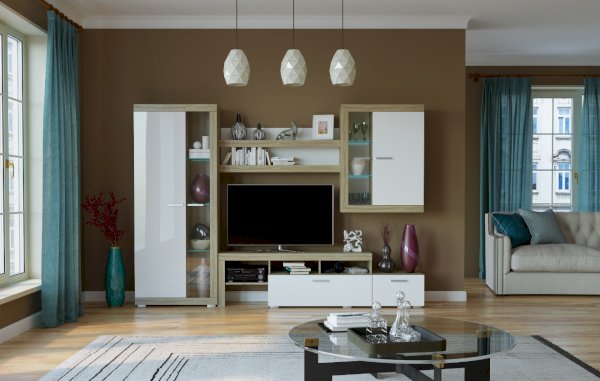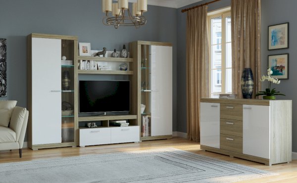 В гостиной Соната применяются современные европейские декоры: корпус выполнен из ЛДСП Дуб сонома, фасад из ЛДСП Белый глянец. Декоры отличаются выраженной тёплой древесной текстурой, а фасадная часть подчёркнута горизонтальными линиями текстуры и стильными планками МДФ, представляющими собой элементы корпуса и фасада.