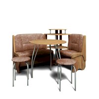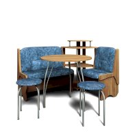 Оригинальный кухонный уголок Лотос отличается от других похожих кухонных гарнитуров. Он состоит из двух отдельных диванчиков и этажерки, заменяющей угловую мягкую часть. Круглый кухонный стол в отличие от других наборов мебели на металлическом основании как и два круглых табурета. Набор мебели для кухни включающий в себя большую прямую скамью,малую прямую скамью,угловую этажерку, стол на металлических ногах и два табурета на металлокаркасе. В прямых скамьях под сиденьями расположены ящики.
